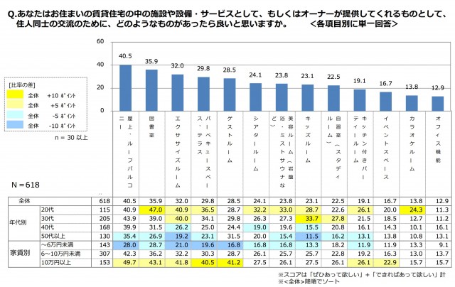住人同士の交流のためにあったほうがいいと思うイベントとしては、 「防災訓練、避難訓練」(32.7%)との回答がもっとも多かった。また、住人交流のためにあったら良いと思う共有設備・サービスは「屋上、ルーフバルコニー」(40.5%)、「図書館」(35.9%)、「エクササイズルーム」(32.0%)がトップ3だった。