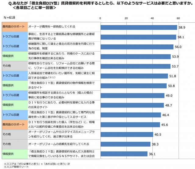 DIY型賃貸借契約を後押しするのに必要なサービスとしては、「オーナーが費用を一部負担してくれる」(58.9%)、「必要な修繕箇所と必要な経費が明らかになっている」(58.1%)など、費用面、トラブル回避のニーズが高かった。