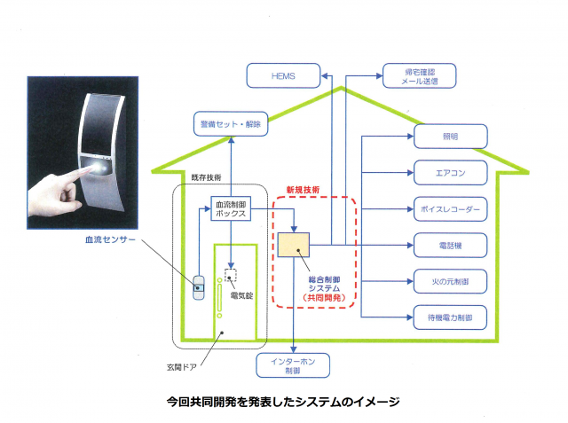 ヤマダ・エスバイエルホーム(大阪市北区)とバイオニクス(大阪市中央区)および日本工学院専門学校(東京都大田区)は6月24日、血流認証技術を活用した住宅総合制御システム「Fin-Key(フィンキー)」を共同で研究・開発することを東京都内で発表した。