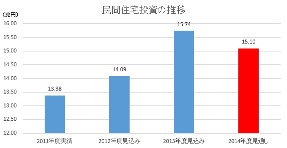 国土交通省は6月27日、2014年度建設投資見通しを公表した。民間住宅投資は前年度比4.1%減の15兆1000億円となる見通し。2013年度の民間住宅投資は15兆7400億円の見込み。
