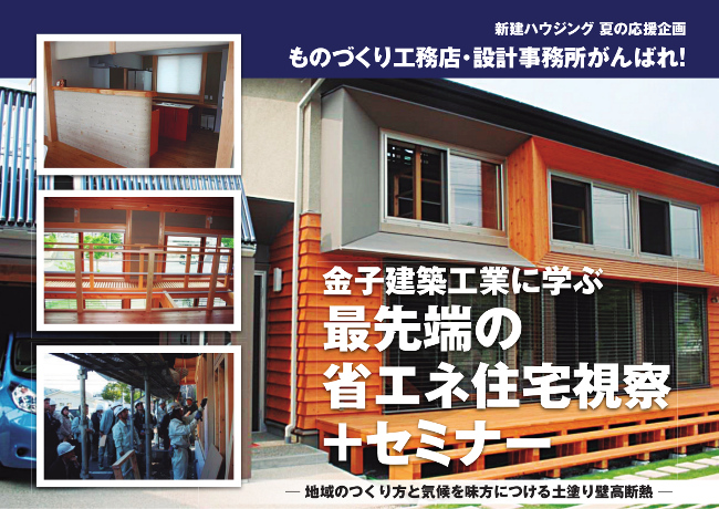 新建ハウジングでは今回、地元の木と土によって最先端の省エネ住宅をつくる金子建築工業の施工現場と完成住宅の視察セミナーを企画しました。ゼロエネルギー、さらにLCCM(ライフサイクルカーボンマイナス)を実現するモデル棟と新築・改修中の現場から、断熱・気密の手法と太陽・風のパッシブ利用を見ることができます。矢継ぎ早に繰り出されてきた省エネ政策に、中小事業者はとかく翻弄されがちでしたが、同社の家づくりは一貫して地域の工務店・設計事務所こそが省エネの主役であることを指し示しています。地域の気候を知る「強み」を生かし、地元の技術に立脚した省エネ住宅のディテールを展開していく方法を、長年蓄積してきたデータや経験をふまえつつ解説していただきます。