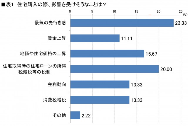 住宅購入に際してもっとも影響を受けそうなことを聞くと、「景気の先行き感」(23.3%)が最多で、「住宅取得時の住宅ローンの所得税減税等の税制」(20%)、「地価や住宅価格の上昇」(16.7%)が続いた。