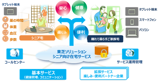 今後、地区内の高齢化が予想されることから「福祉の街・快適な街・楽しむ街」をコンセプトに、東芝ソリューションのシニア向け在宅サービス「大人の自由時間」を活用したヘルスケア+ライフケアサービスを地域密着で展開する。
