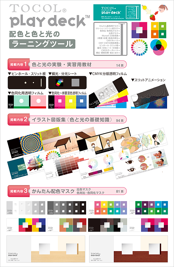 ピンホール・スリット板、偏光・分光シート、色相環を20色相として並べた透明フィルムといった実験・演習用ツールをはじめ、色と光に関する基礎知識が一目で確認できるイラスト図版シート、あらかじめ用意された木材14種類・畳1種類の画像に使いたい色をあてることで容易にインテリアの配色シミュレーションができる「かんたん配色マスク」などを収録した。