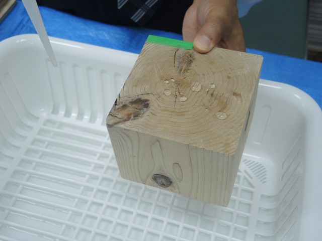 そこで同社では今回発売する「ホウ酸溶脱防止液」を開発。高濃度ホウ酸水溶液25L〜30Lに対し、同製品を1L混入することで、木材に処理するホウ酸の雨水による劣化を抑えることが可能となるという。成分は非イオンフッ素系エマルション。