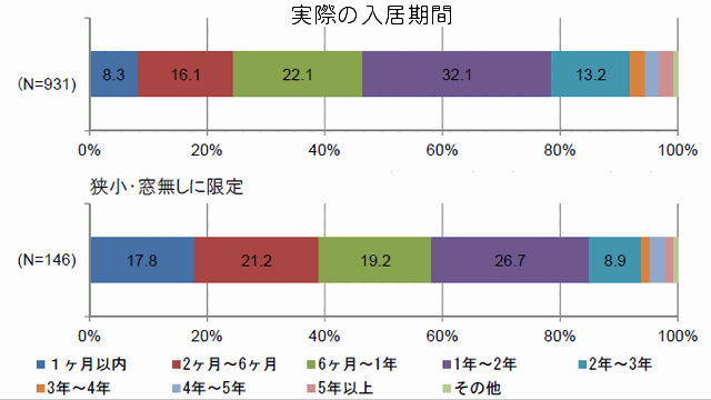 居住環境では、面積が5m2未満、または窓なしの物件が16%を占めた。実際の入居期間は1年未満が5~6割を占める。