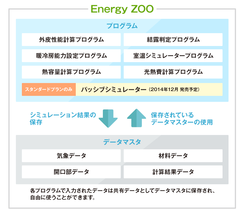 プログラムは、平成25年基準の算定方法に準拠した外皮性能計算を行いながら、さらに入力項目を活用して、結露判定・光熱費計算・室温シミュレーション・熱容量計算・暖冷房能力設定までをシームレスに計算できる。