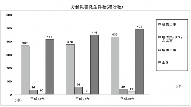 それによると労災(休業4日以上、一人親方や事業主災害等を含む)の発生件数は492件(前年446件)で、新築は433件(同378件)と顕著に増えた。1000棟あたりの発生件数でみると0.87件(同0.83件)だった。
