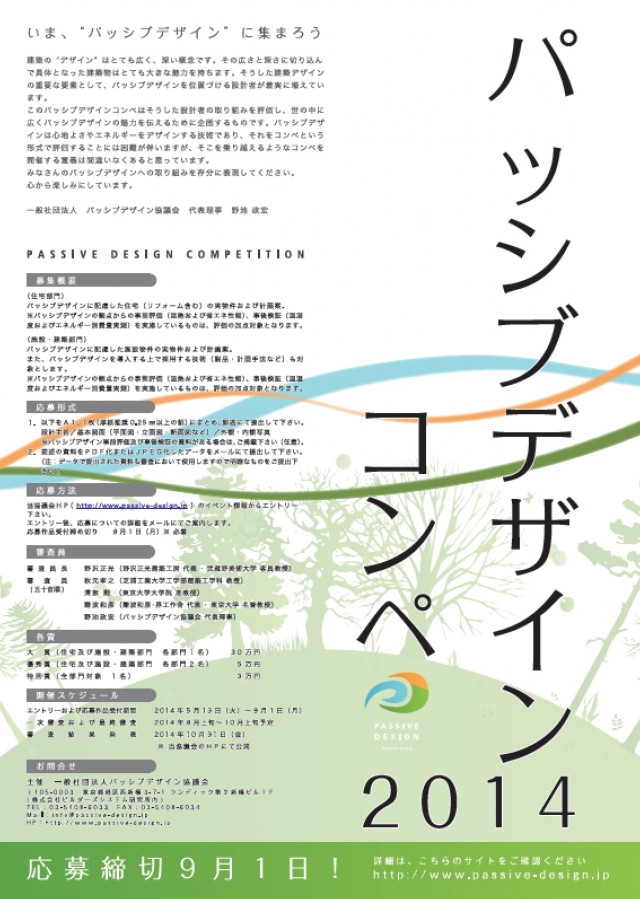一般社団法人パッシブデザイン協議会(事務局:東京都港区、野池政宏代表理事)は今年も、パッシブデザイン設計者の取り組みをコンペ形式で評価する「パッシブデザインコンペ2014」を開催する。