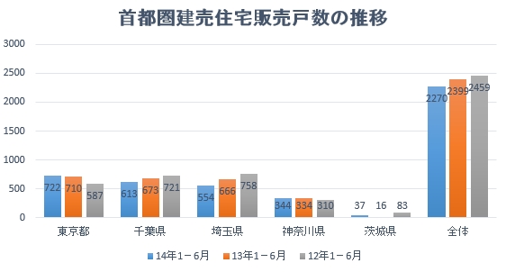 不動産経済研究所が7月15日発表した2014年1-6月期の首都圏の建売住宅の新規発売戸数は2270戸で、前年同期に比べ129戸少なく、5.4%減だった。埼玉・千葉が落ち込んだ。売れ行きは0.8ポイントダウンの45.5%、価格は3.0%上昇の4628万円だった。