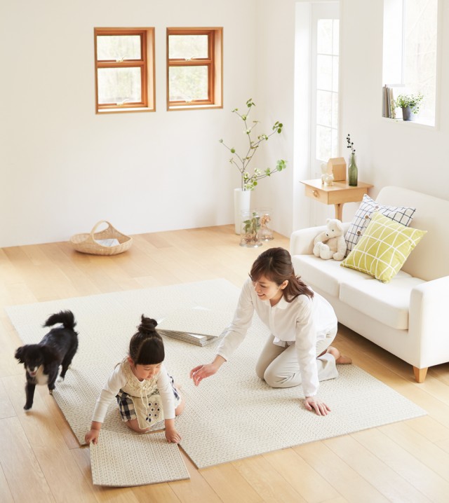 接着剤を使わず、フローリングの上に手軽に置敷きが可能。よごれた部分だけ取り外して手洗いできるほか、ペット対応や肌触りのいいタイプを拡充した。 40センチ角と50センチ角の2サイズ。5000〜9000円/m2。