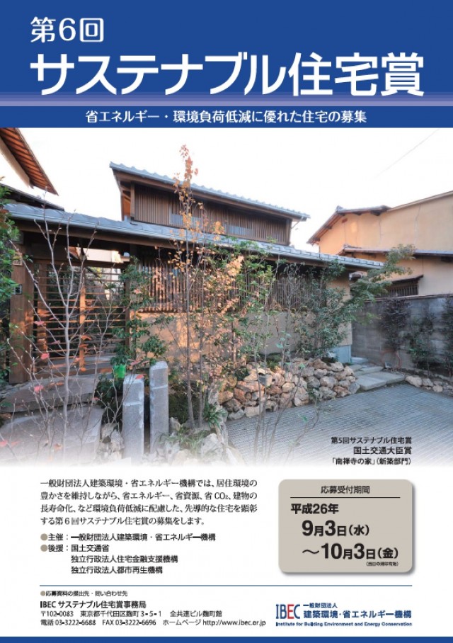 建築環境・省エネルギー機構(東京都千代田区)は、省エネルギー・環境負荷低減にすぐれた住宅を募集する「第6回サステナブル住宅賞」を実施する。