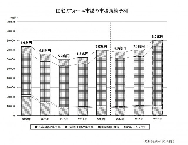 国の施策による後押しやリフォーム適齢期を迎える住宅ストック数の増加、リフォーム事業者の営業強化などにより市場が大きく活性化した場合、2020年には8兆円(2010年比35%増)をまで拡大するとした。