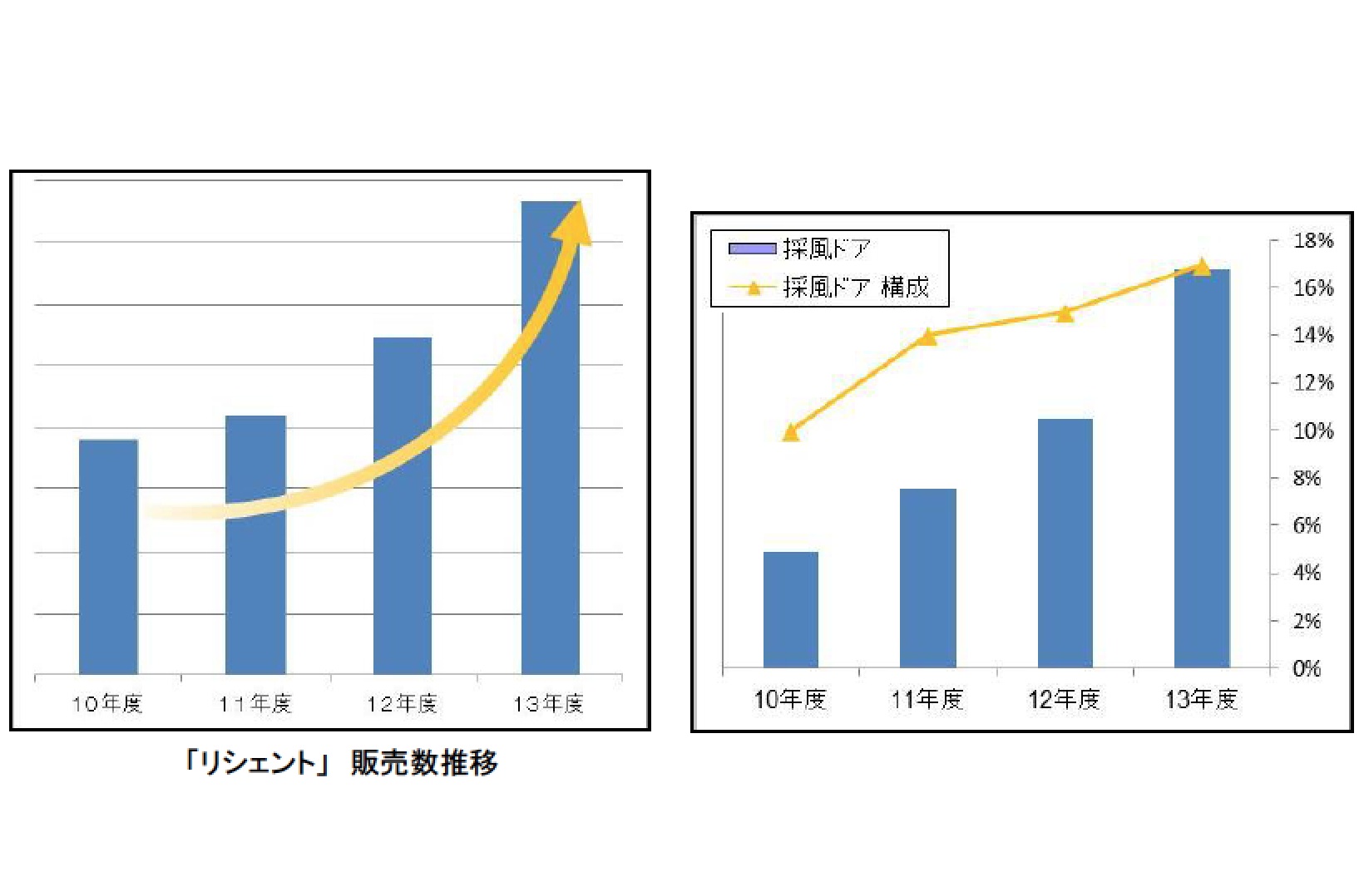 最近は、省エネ意識の高まりから玄関扉を閉めたまま採風できるタイプの人気が上昇。2013年度の販売数は前年度比60%増と、2010年度の3倍に。採風タイプが玄関リフォームの販売をけん引している。
