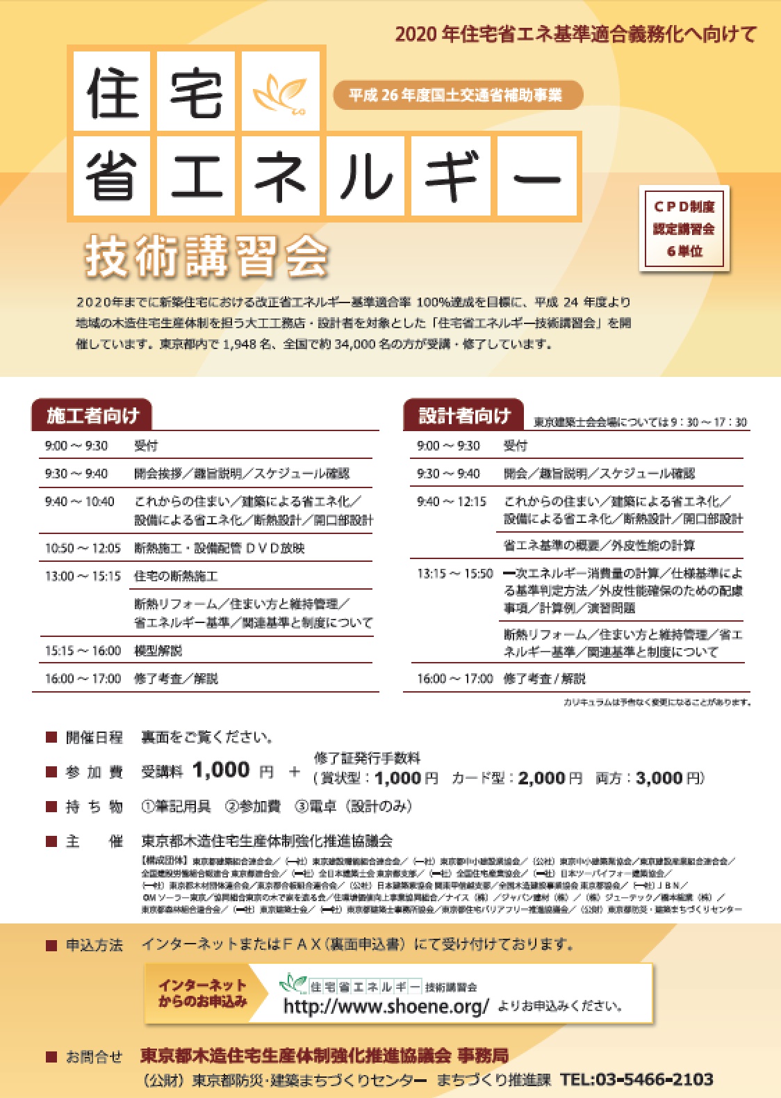 東京都木造住宅生産体制強化推進協議会(事務局:東京都防災・建築まちづくりセンター、東京都渋谷区)は、改正省エネ基準適合率100%をめざし、工務店や設計者を対象にした「平成26年度 住宅省エネルギー技術講習会」を開催している。昨年度までに都内で1948人、全国で約3万4000人が受講・修了した。