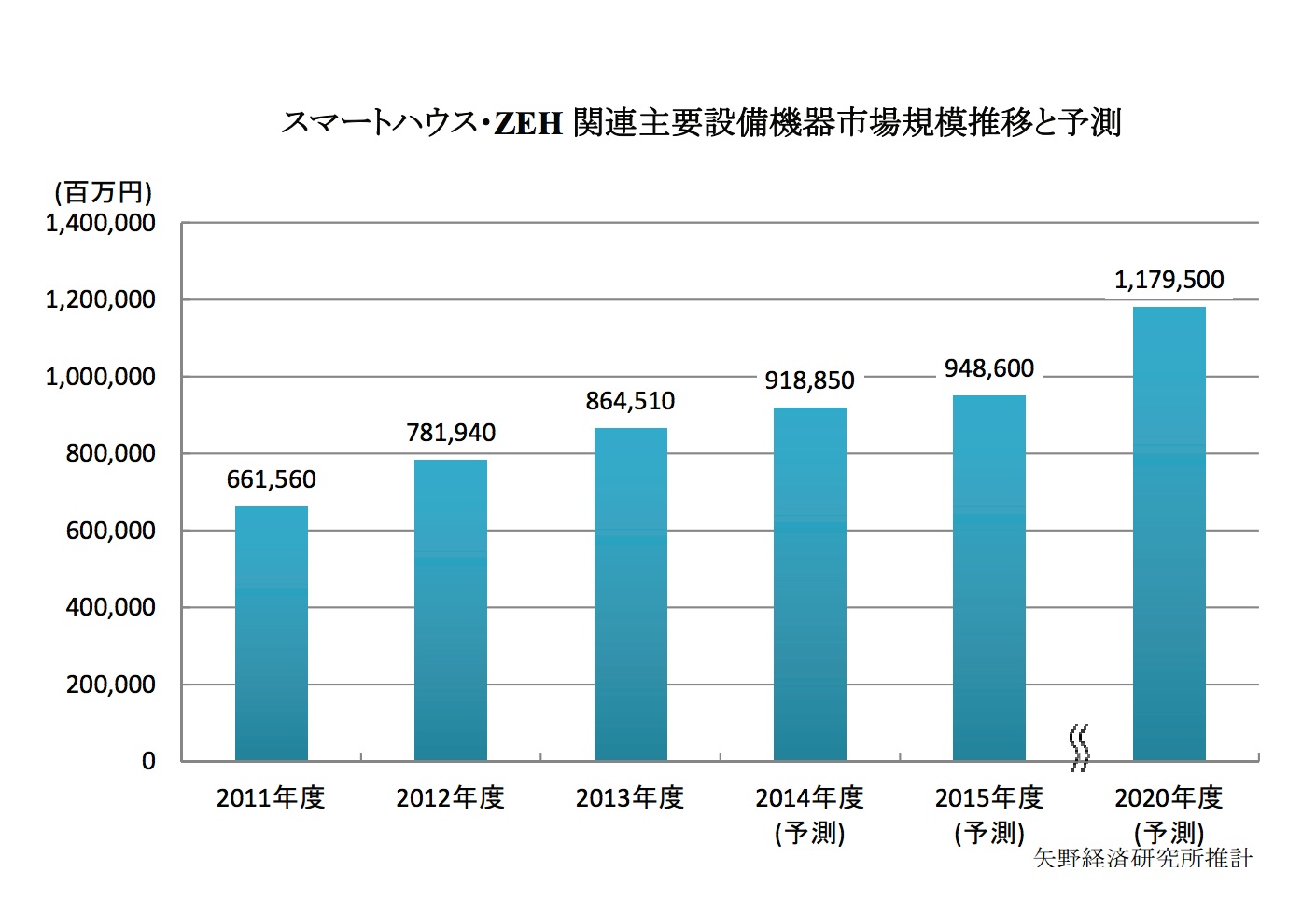16年に電力小売の全面自由化が実施されれば時間帯料金メニューが多様化し、太陽光で発電した電力や割安な深夜電力を蓄えて自宅で消費する電力消費スタイルが増加するとした。これとともに市場が本格的に拡大し、2020年度の市場規模は2011年度比78.3%増の1兆1795億円と予測する。