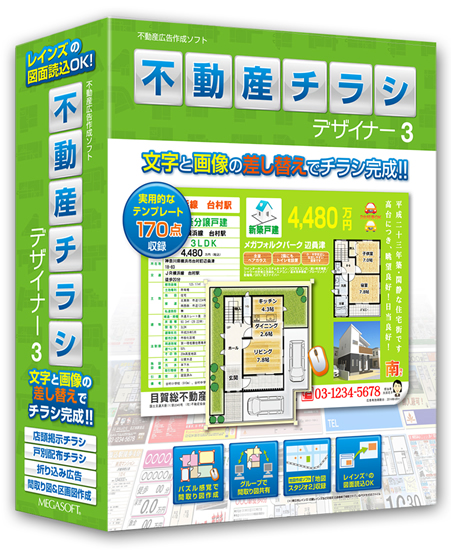 メガソフト(大阪府大阪市)は8月28日、不動産業者向けに文字と画像を入れ替えるだけで簡単・低コストでチラシが作成できるWindows用ソフト「不動産チラシデザイナー3」を発売する。