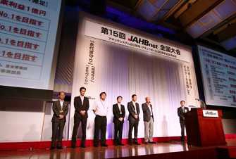 会員向けイベント「第15回ジャーブネット全国大会」で決意表明する参加企業(7月3日、目黒雅叙園=東京)