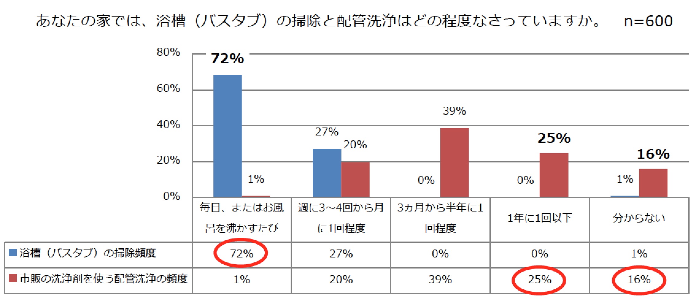 浴槽掃除をどのくらいの頻度で行うか聞くと、「毎日、またはお風呂を沸かすたび」(72%)、「週に3〜4回から月に1回程度」(27%)に分かれた。市販の洗浄剤を使う配管洗浄については、「3カ月から半年に1回程度」(39%)がもっとも多く、「1年に1回以下」(25%)が続いた。