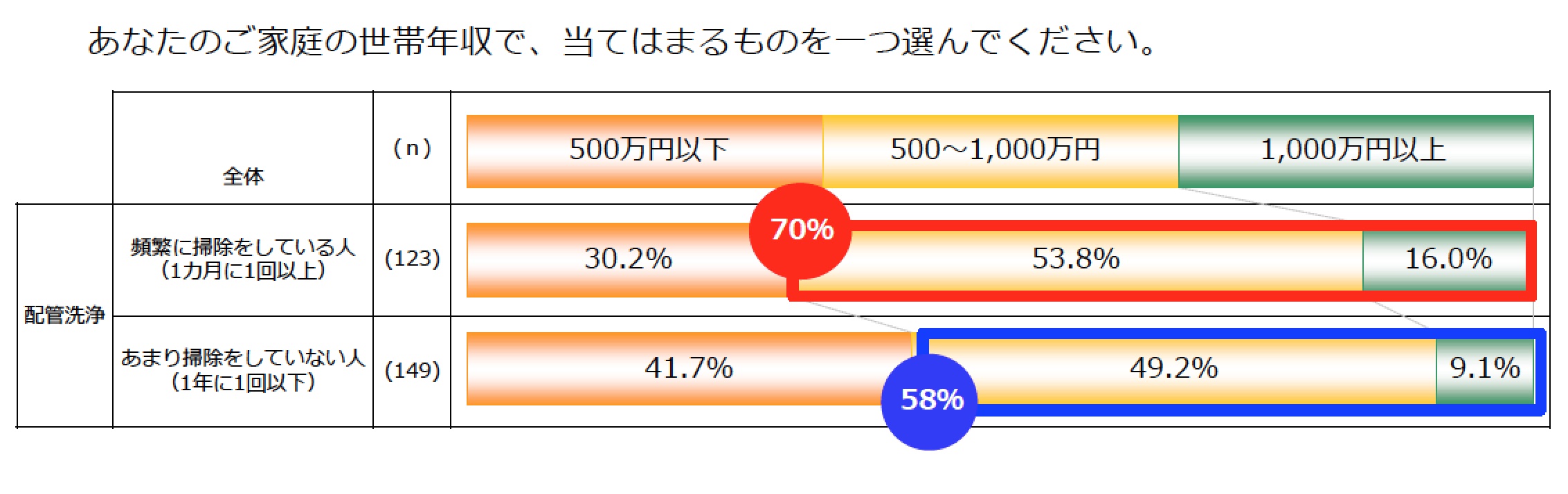 調査では、配管洗浄を1カ月に1回以上と頻繁に行う家庭ほど夫婦仲を気遣いあったり、料理上手だと言われる割合が高いことがわかったという。また、配管洗浄を頻繁にする家庭は世帯年収が高い傾向にあり、頻繁な家庭の約7割(500〜1000万円:53.8%、1000万円以上:16%)が500万円以上だったのに対し、1年に1回以下の頻繁でない家庭は約6割(500〜1000万円:49.2%、1000万円以上:9.1%)だったとする。