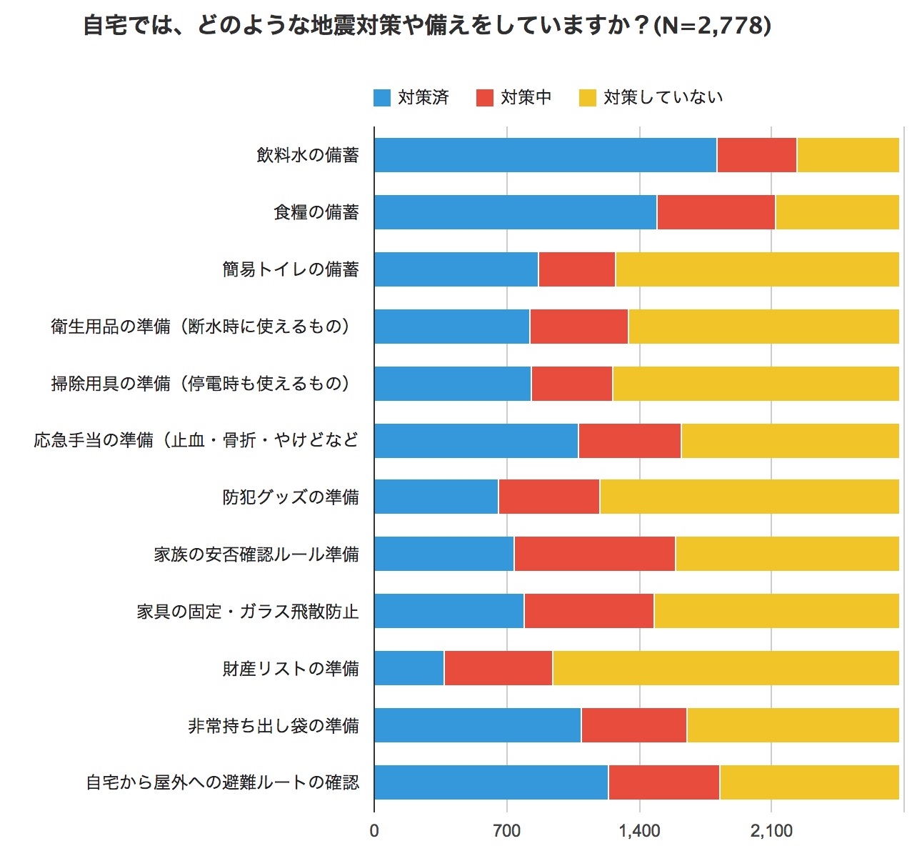 在宅時に地震が発生した場合に無事でいられると思うかとの問いには「無事だと思う」(約4割)との回答がもっとも多く、「すり傷など軽傷を負う」「落下物や転倒物により打撲を負う」など軽微な被害にとどまるとの見方が占めた。