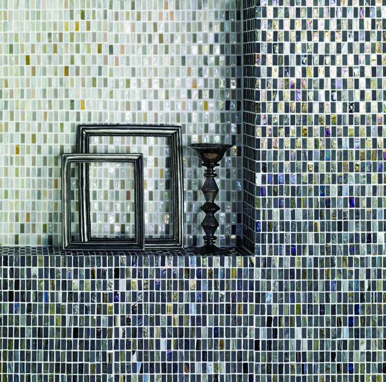 約25x12ミリにカットした天然石とガラスを市松張りにしたモザイクタイル。マットな質感の石と、さまざまな色合いに輝くガラスのコントラストが楽しめるという。