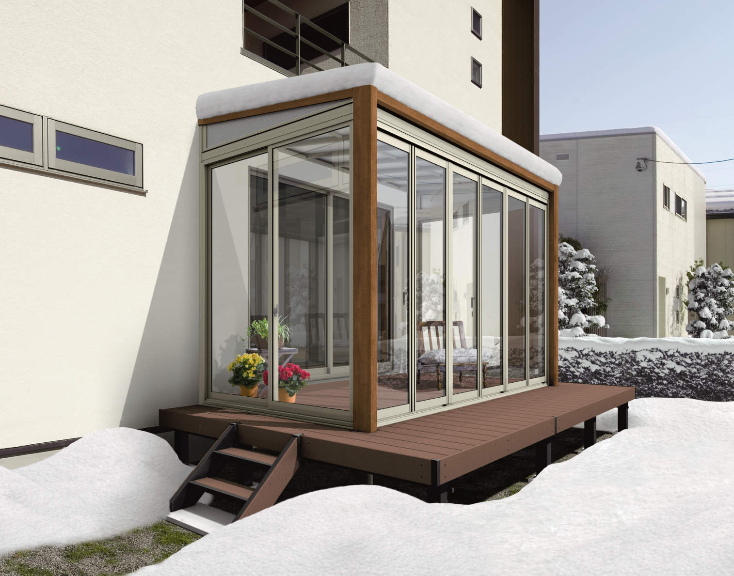 組み合わせ参考価格85万8900円(デッキON仕様耐積雪100cmタイプ、サイズ:間口3636x出幅1843mm、開口部:前面・折りたたみ、側面・引違い)