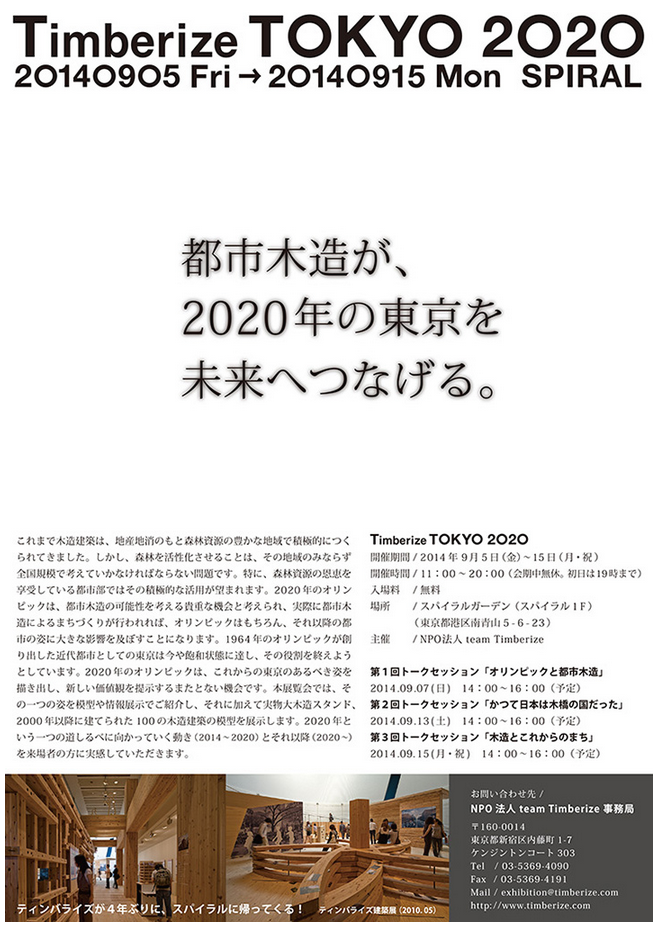 若手の建築士や研究者の有志でつくるNPO法人「team Timberize(チーム・ティンバライズ)」は、2020年東京オリンピックのために新たに建築する施設の木造化を提案する企画展「Timberize Tokyo 2020」を9月5日(金)〜15日(月・祝)まで東京青山のスパイラルガーデン1階(港区南青山5−6−23)で開催している。