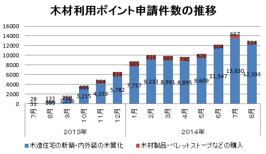 8月単月の申請件数をみると、木造住宅の新築・内外装の木質化が1万2393件で、過去最多を記録した前月(1万3630件)よりも減少した。木材製品などによる申請は524件で、こちらも前月(667件)より少なかった。