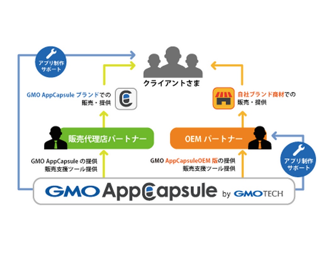 GMO TECH(東京都渋谷区)は9月16日、ウェブ制作会社やマーケティング会社、広告代理店向けに、店舗アプリを簡単に作成できるASPサービス「GMO AppCapsule(アップカプセル)」の販売代理店パートナー制度およびOEMパートナー制度を始めた。