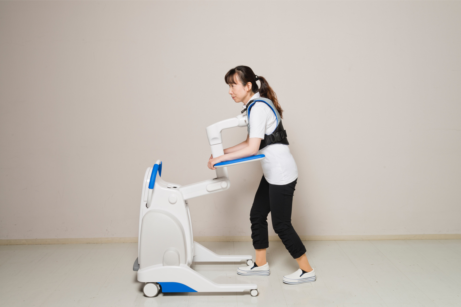 「自立支援型起立歩行アシストロボット」は、被介助者の起立・着座・静止(衣服着脱時)を検知し自立的動作をサポートするもの。小型・軽量なためトイレへの移動・移乗も支援でき、介護者の負担軽減につながる。