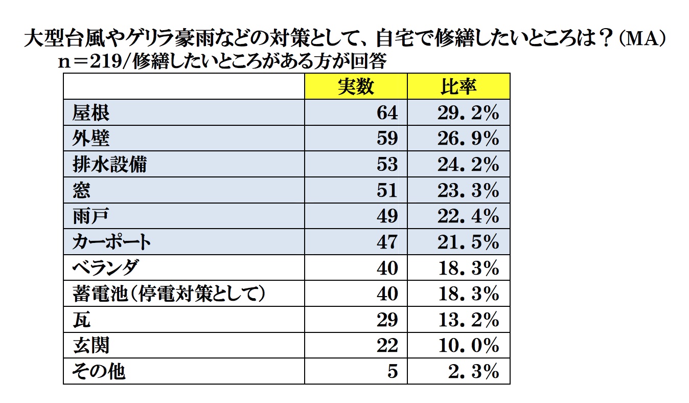 災害対策として自宅で修繕したいところがあるかとの問いには「ある」が39.8%。修繕したい場所は「屋根」「外壁」「排水設備」「窓」「雨戸」の順に多かった。