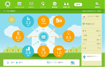 電力ピークカット機能を搭載しており、あらかじめユーザーが設定した電力量を超えそうな時、ユーザーが選択した順番で機器の電源を自動で切ることができる。蓄電池と組み合わせて使うことで、翌日の天気予報に基づき太陽光の発電量を予測し、蓄電池へ貯める最適な蓄電量を計算し蓄電することもできる。
