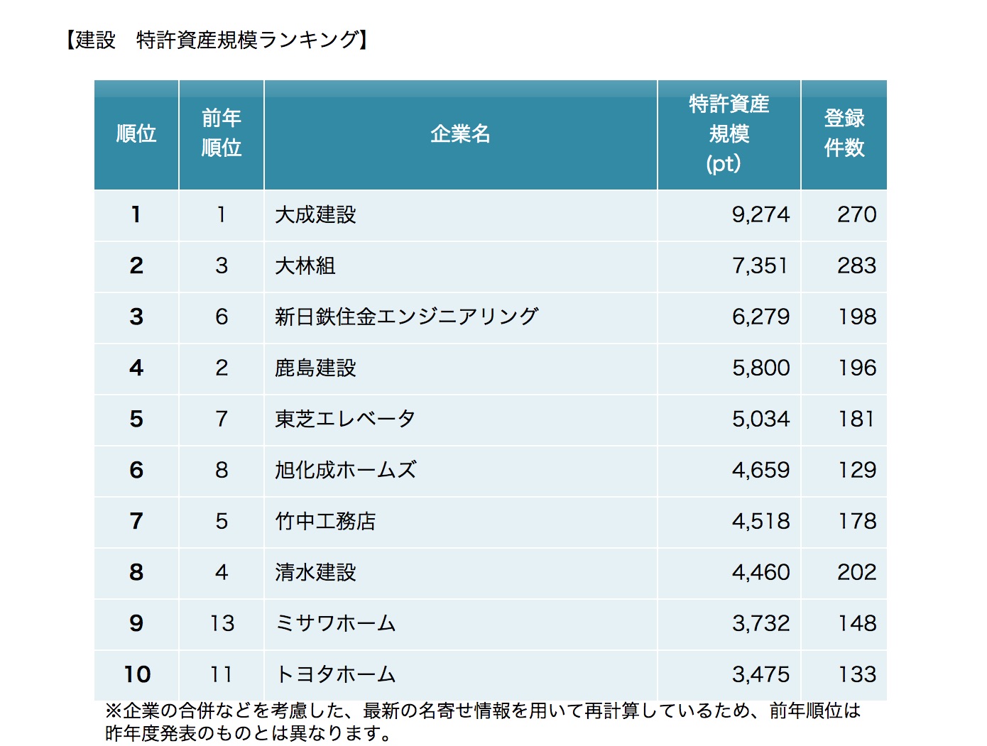 パテント・リザルト(東京都台東区)は10月30日、建設関連企業が保有する特許資産を質・量の両面から評価した「建設業界 特許資産規模ランキング」をまとめた。その結果、1位は大成建設、2位は大林組、3位は新日鉄住金エンジニアリングとなった。