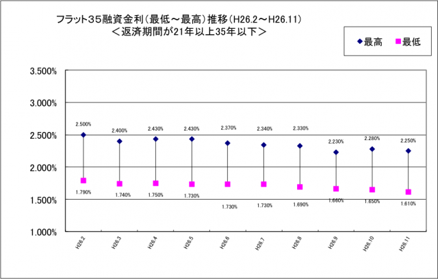 住宅金融支援機構(東京都文京区)は11月4日、民間金融機関が提供する「フラット35」の2014年11月の適用金利を公表した。