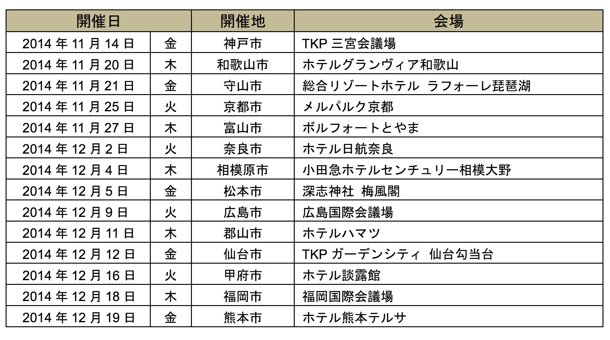 11月14日の神戸を皮切りに11月10日時点で14カ所で実施する。開催地は順次追加予定。