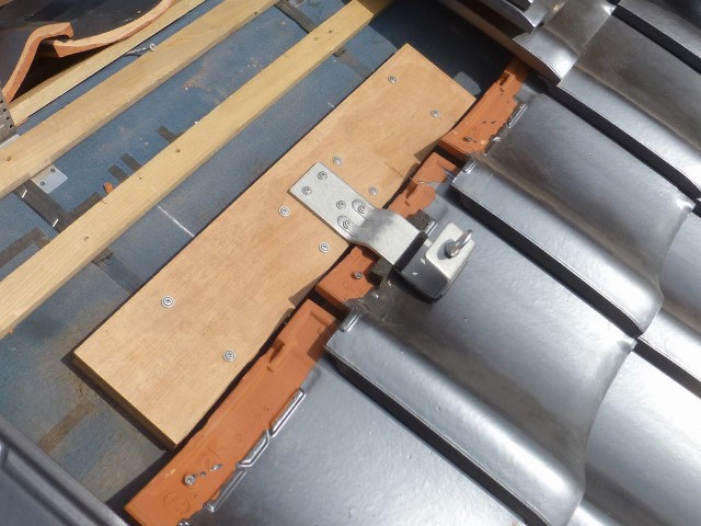 垂木に2枚重ねの固定台をしっかりと取り付けたうえで、金具本体を設置。屋根の2カ所にこの金具をあらかじめ固定しておくことで、屋根の点検や太陽光発電工事の作業時に親綱を張るなどして転落事故を防ぐのに役立つ。