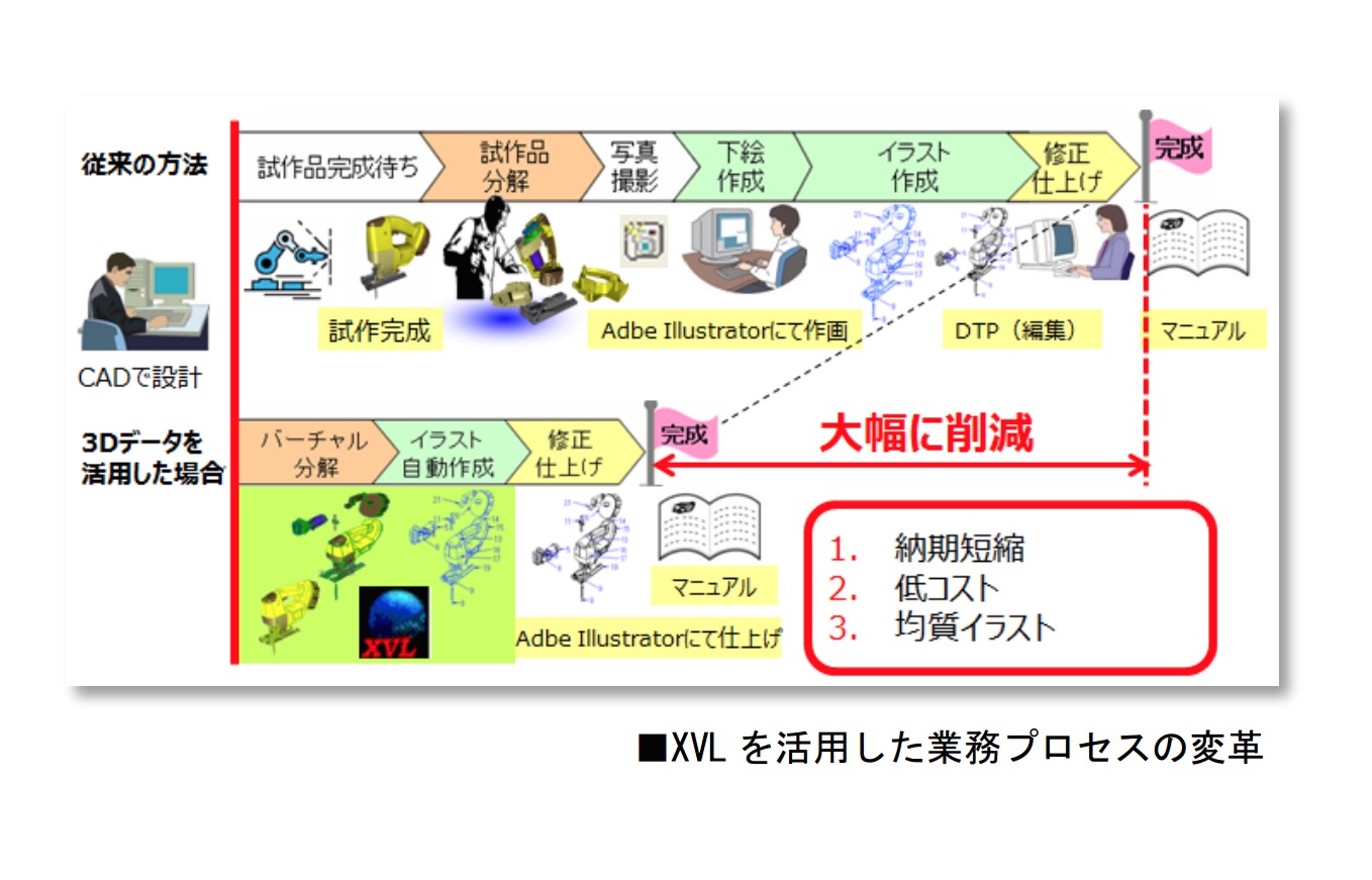 試作品の製作・分解、写真撮影、イラスト作成などを個別に行う時間・手間を省略し、納期短縮とコスト削減を実現する。