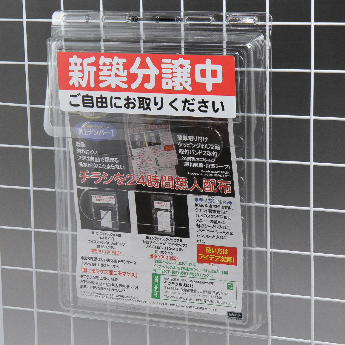 「インフォパック」は、建築現場の壁やフェンスなどに付属のねじや結束バンドで取り付けてチラシを24時間無人配布するツール。耐候性にすぐれたPET樹脂製で、フタは自動クローズ式のため雨天でもチラシをぬらす心配がない。