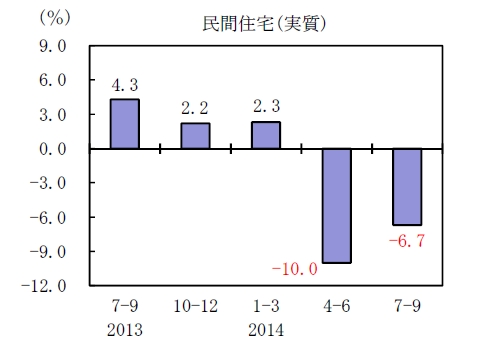 内閣府が11月17日発表した2014年7-9月期のGDP成長率(一次速報値)は実質でマイナス0.4%と、2四半期連続でマイナスとなった。民間住宅投資は実質でマイナス6.7%。14年4-6月期のマイナス10.0%からマイナス幅は縮小したが、2四半期連続でマイナスとなった。消費増税による駆け込みの反動が続いている。
