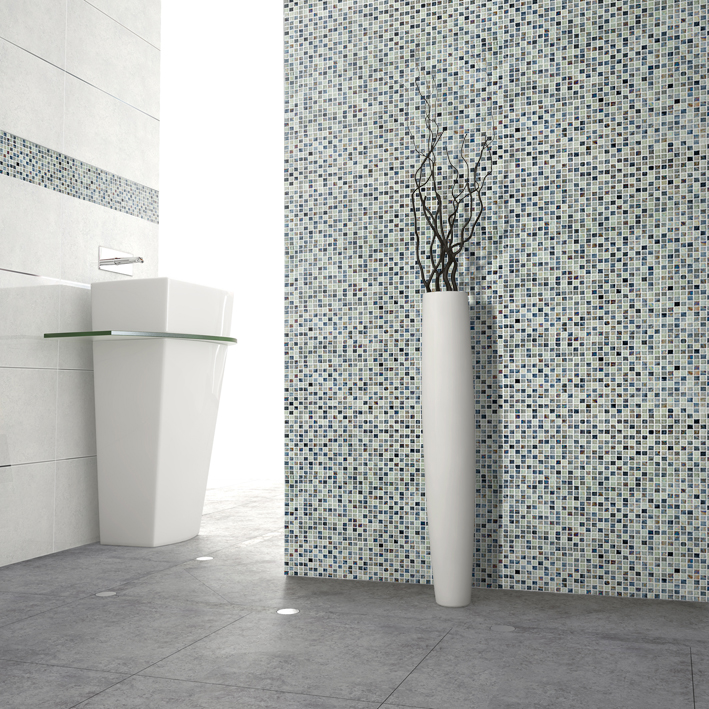 「CANDY Glass(キャンディーグラス)」は、20角のガラスビーズを304角のシートに加工したハンドメイド感が特徴で、光があたるときらりと輝く。4色。1万1000円/平米。