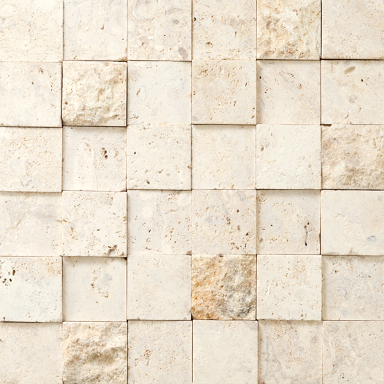 屋内外の壁に適した「Coral mosaico(コーラルモザイコ)」は、天然石灰岩のモザイク。さまざまな厚みのフラットと割肌を組み合わせることで、柔らかみのある壁を表現する。また、撥水加工がほどこしてあるため、外壁にも。1万2800/平米〜。