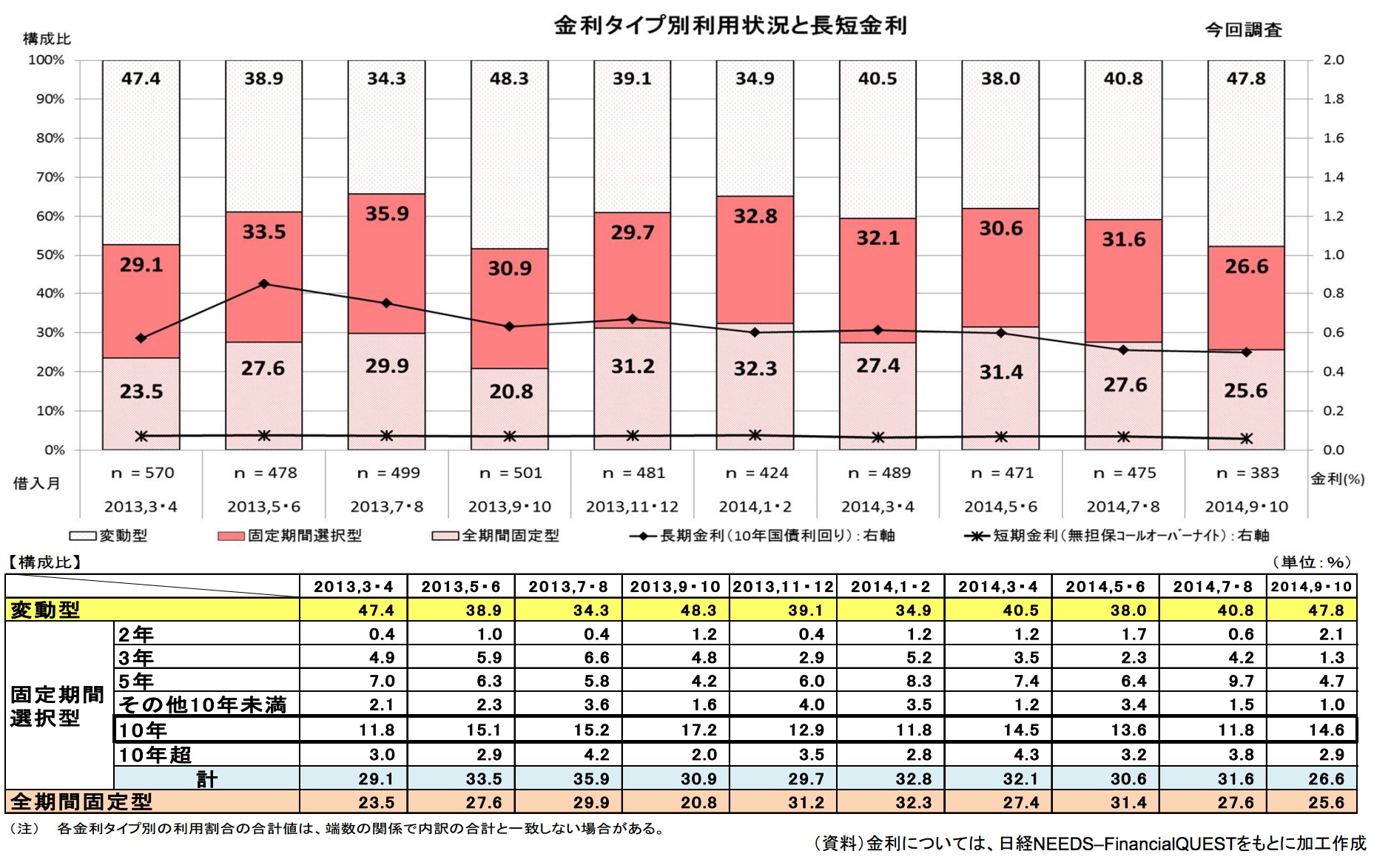 7・8月期に増えた「変動型」の利用割合がさらに7ポイント上昇し、47.8%に。「固定期間選択型」は7・8月期より5ポイント減の26.6%、「全期間固定型」は2ポイント減の25.6%だった。