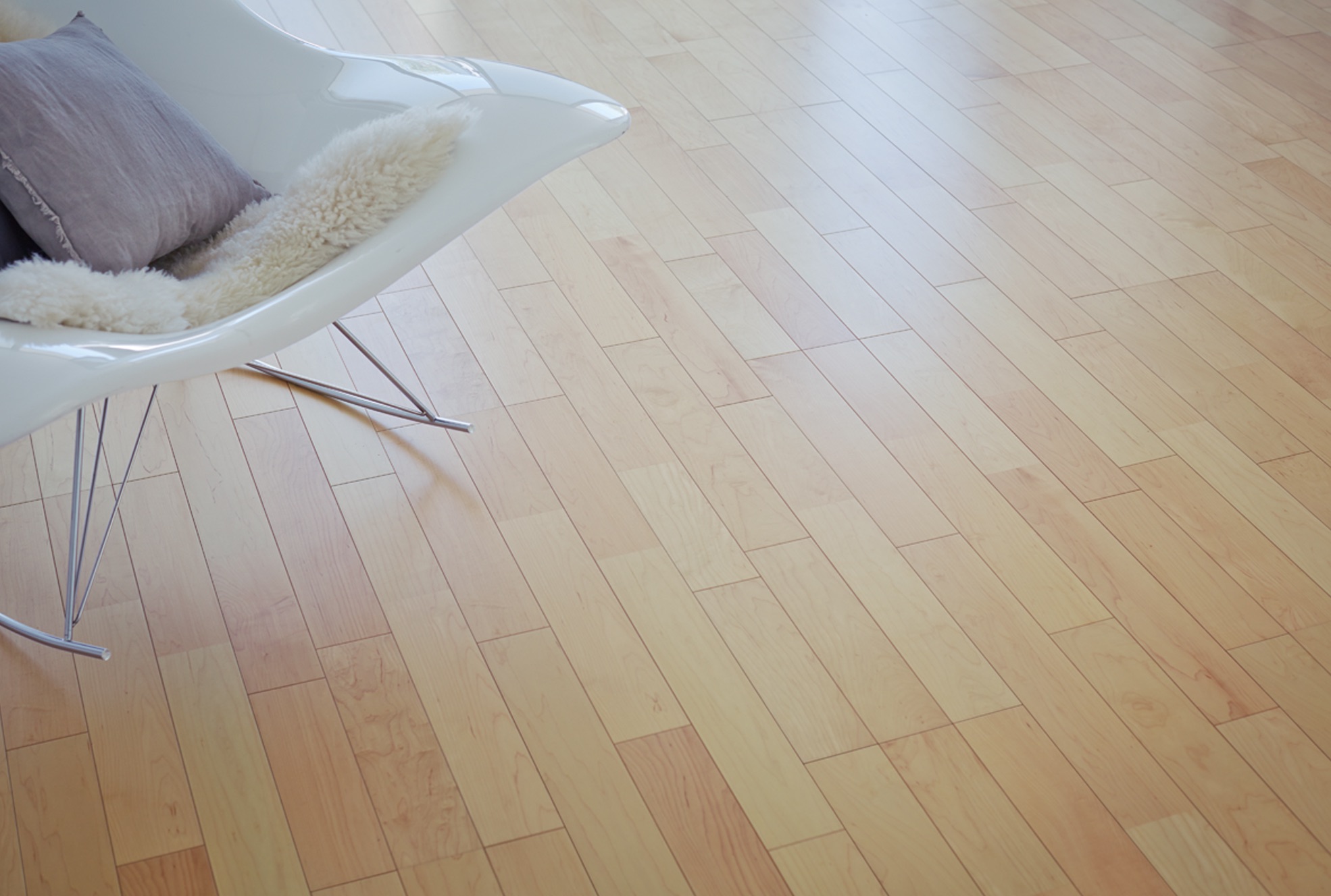 「木味醸成化処理」により天然木のみずみずしさを再現、杢理を際立たせた。キズがつきにくく床暖房にも対応する。 樹種はメープル、チェリー、ウォルナットの3種類。303x1818x3。坪3万9000円〜。