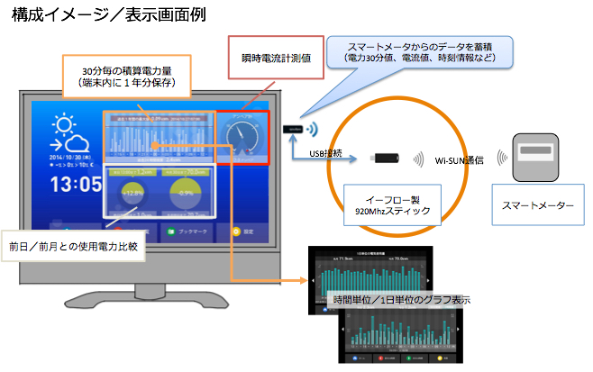 この新製品を使うことで、電力30分値や電流値などをリアルタイムで取得し、家庭のテレビに電力使用状況を表示することができる。