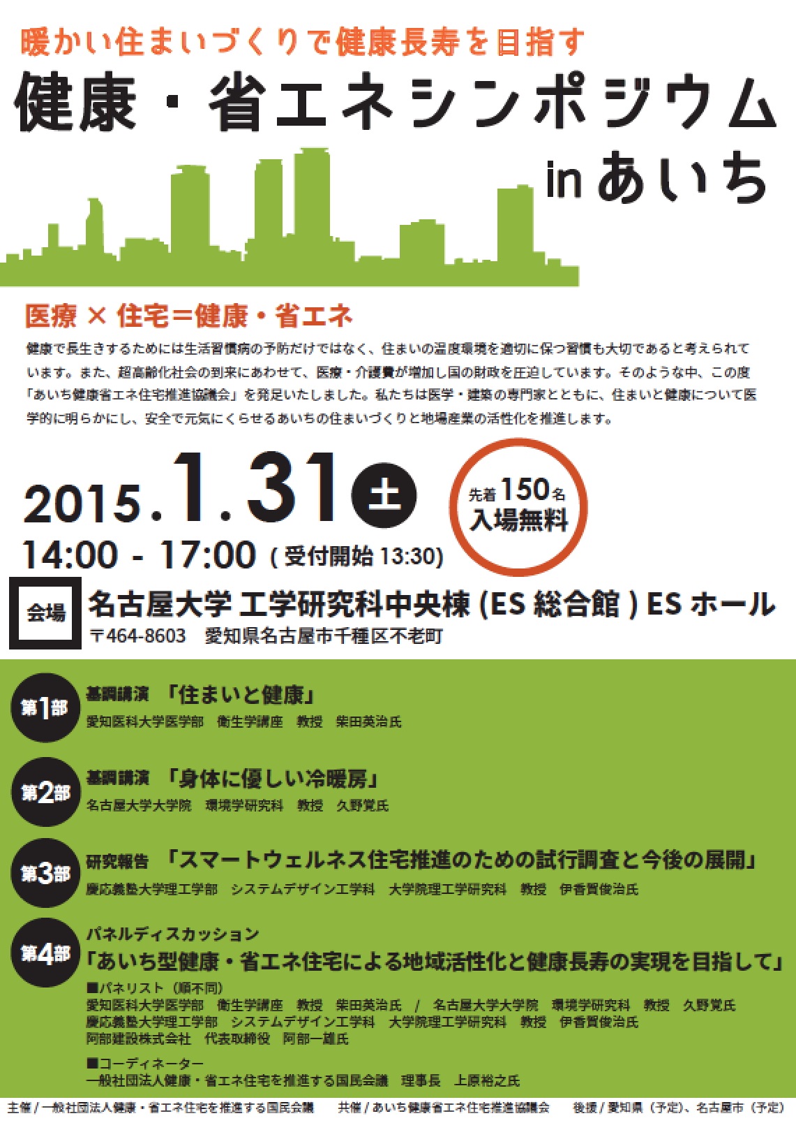 健康・省エネ住宅を推進する国民会議(大阪府四條畷市)とあいち健康省エネ住宅推進協議会(愛知県名古屋市)は1月31日、名古屋大学において「健康・省エネシンポジウムinあいち」を開催する。