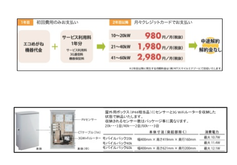 新プランは、導入時にエコめがね全量モバイルパック機器代、1年間のサービス利用料を太陽光発電システムの販売会社から購入し、2年目以降は月額のサービス利用料を同社にクレジットカード払いするというもの。