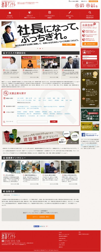 アロッツ(東京都渋谷区)は、起業・独立希望者向け求人ウェブサイト「建設アントレnavi」を1月9日に開設した。起業・独立希望者向けに特化していることが特徴。