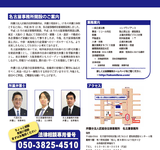 匠総合法律事務所は、東京、大阪に続いて、名古屋に3拠点目となる事務所を開設した。岐阜県多治見市出身の吉川幹司弁護士が統括弁護士となり、三重県津市出身の萩野貴光弁護士が常勤する。1月9日に開催した事務所開きには100人を超える来場があった。