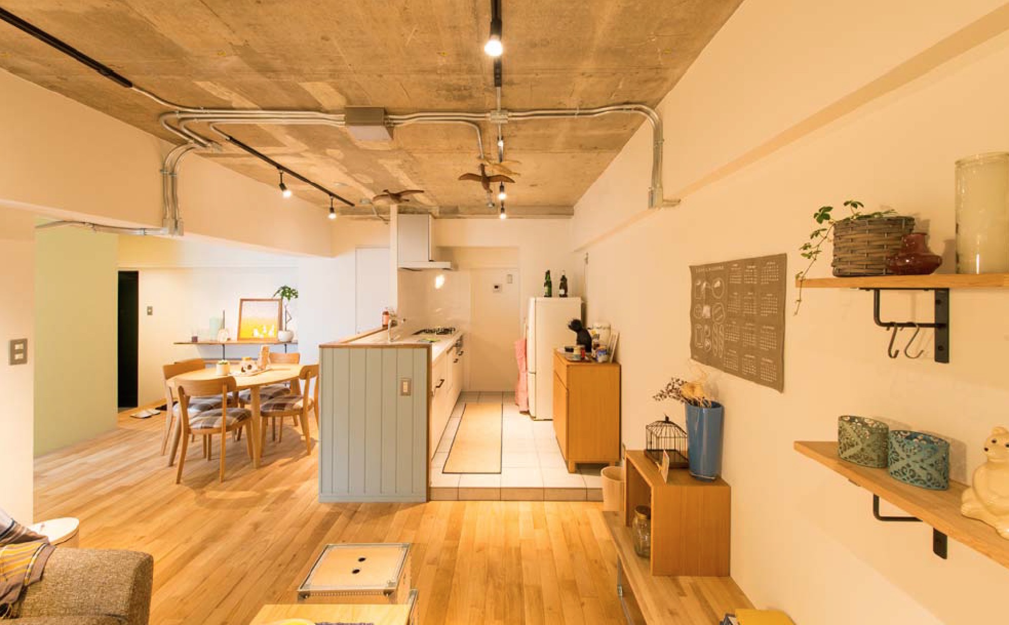 築27年、細かく仕切られた3LDKのマンションを広々としたほぼ1室空間にリノベ。既存LDKには窓が1つしかなかったが3カ所から採光できるようにしたことで、豊かなくらしを提案する。新しいインテリアイメージはスカンジナビアンスタイルとした。
